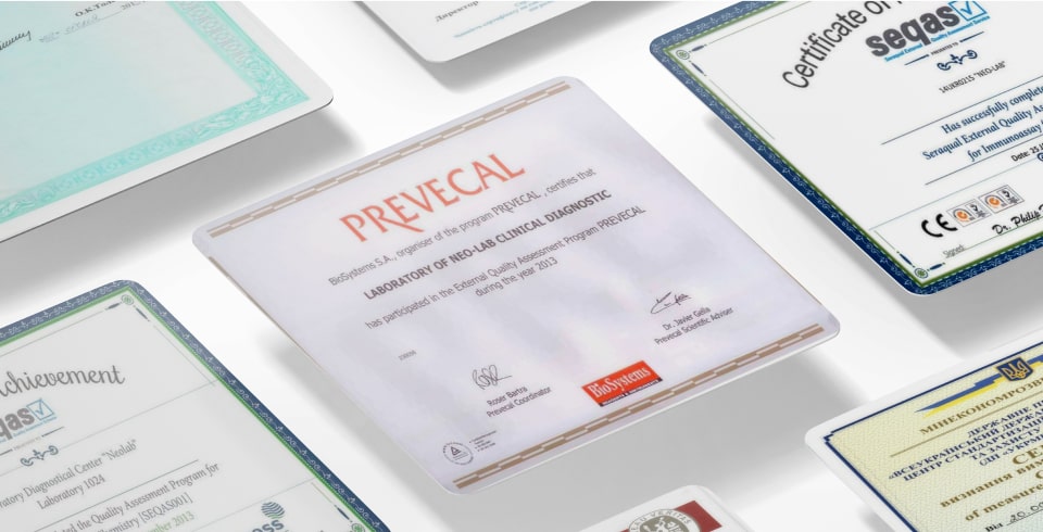 Гарантуємо високу якість і точність результатів аналізів. На всіх етапах проведення досліджень ми використовуємо високотехнологічні автоматичні аналізатори і тест-системи провідних світових виробників. Завдяки застосуванню системи штрихкодування процеси реєстрації, виконання аналізів, отримання та видачі результату повністю автоматизовані, що виключає вплив людського фактору. Ми проводимо щоденний внутрішній контроль якості. Також лабораторія проходить зовнішній контроль якості Українського референс-центру з лабораторної діагностики та міжнародний контроль якості.