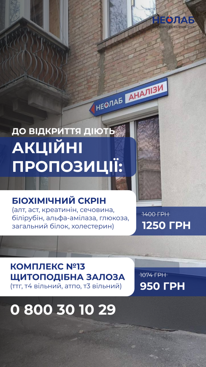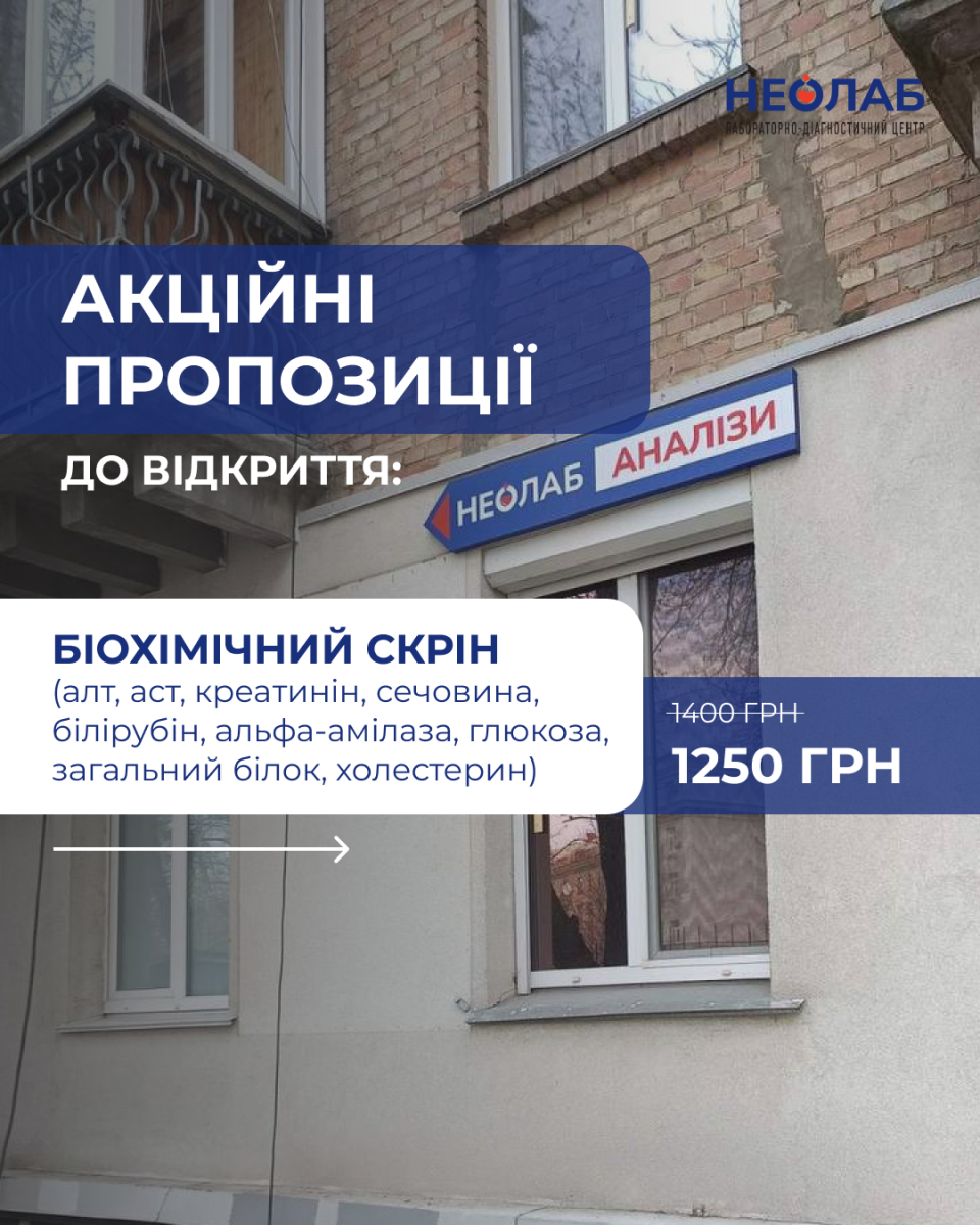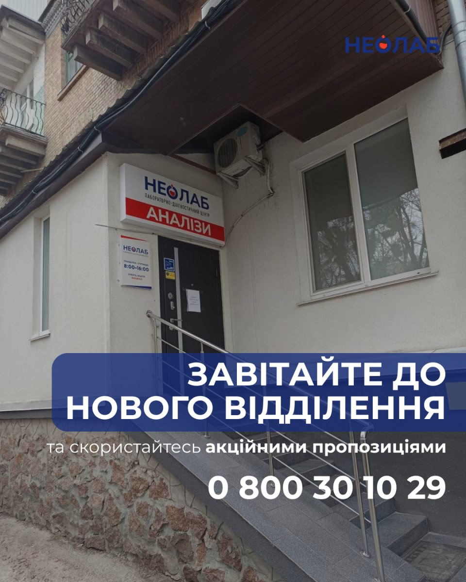Відкриття нового відділення НЕО-ЛАБ дата публікації: 09.04.2026 \ Актуальні новини Переглянути усі новини дата публікації: 17.03.2026 Не знаєте, з яких аналізів почати базову перевірку організму? дата публікації: 24.02.2026 Навіщо витрачати час і їхати до лабораторії, якщо медична сестра приїде до вас додому і виконає забір крові в зручний для вас час Навіщо витрачати час і їхати до лабораторії, якщо медична сестра приїде до вас додому і виконає забір крові в зрочний для вас час дата публікації: 09.12.2025 Гормони щитоподібної залози: чому їх важливо перевіряти? Які аналізи здати щоб перевірити щитовидку та в яких випадках їх призначають? Читайте далі. дата публікації: 27.11.2025 Що таке інсулінорезистентність і як вона впливає на організм? Інсулінорезистентність відіграє ключову роль у механізмі розвитку одного з найпоширеніших захворювань нашого часу – цукрового діабету 2-го типу.